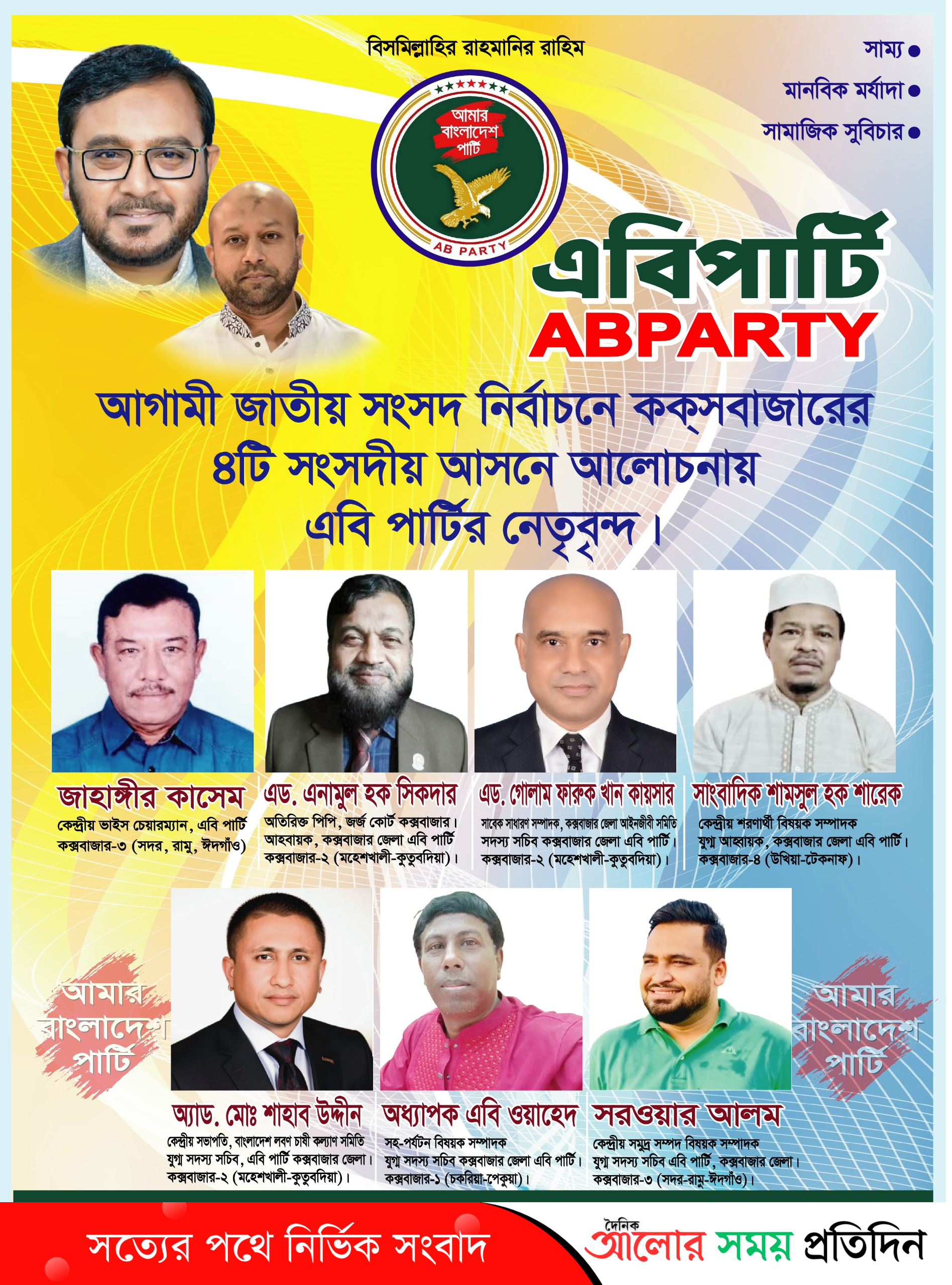 আসন্ন ত্রয়োদশ জাতীয় সংসদ নির্বাচনকে সামনে রেখে কক্সবাজার জেলার চারটি সংসদীয় আসন নিয়ে সরব হয়ে উঠেছে আমার বাংলাদেশ পার্টি (এবি পার্টি)। জেলার রাজনীতিতে দলটির সক্রিয় উপস্থিতি নতুন মাত্রা যোগ করেছে। এবি পার্টির কেন্দ্রীয় ও স্থানীয় নেতৃবৃন্দ ইতোমধ্যে আলোচনার কেন্দ্রবিন্দুতে চলে এসেছেন।