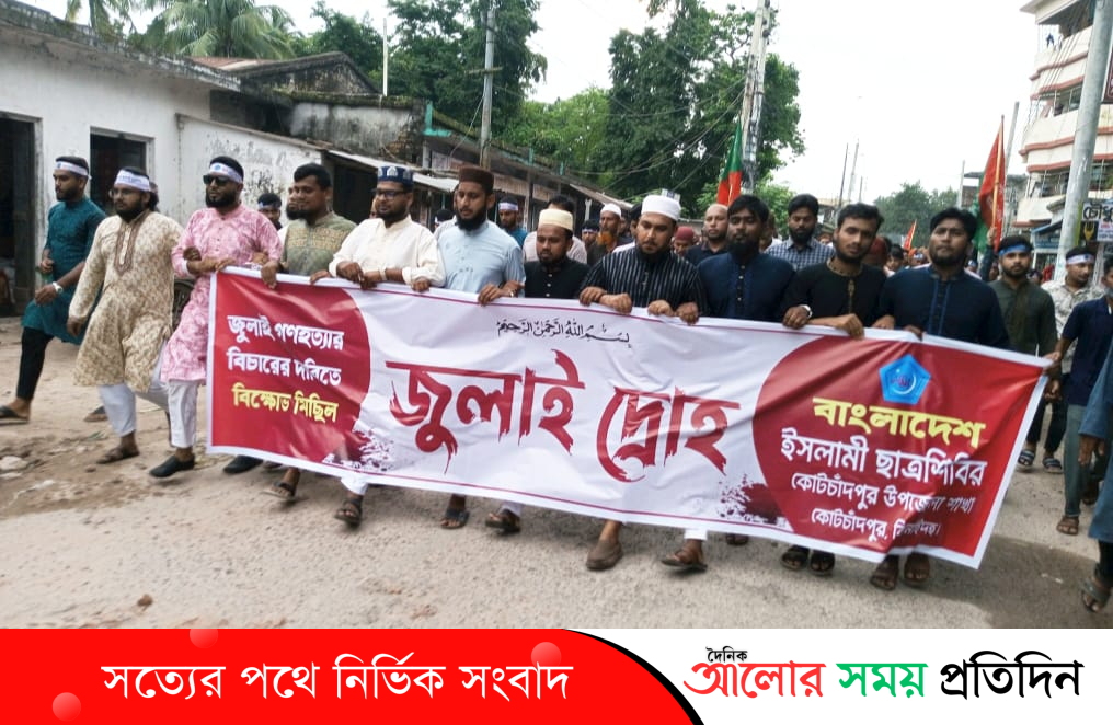 "জুলাই গণহত্যার বিচারের দাবিতে বিক্ষোভ মিছিল ( জুলাই দ্রোহ)-এই স্লোগান লেখা ব্যানার হাতে নিয়ে মিছিলটি বলুহর বাস স্ট্যান্ড থেকে শুরু হয়ে হাসপাতাল রোড, ব্রীজঘাট মোড়, পায়রা চত্বর, পৌর পাঠাগার, পোস্ট অফিস মোড় হয়ে পৌর শহরের গুরুত্বপূর্ণ সড়ক প্রদক্ষিণ করে মেইন স্ট্যান্ডে শেষে হয়। এতে অংশ নেন ইসলামী ছাত্রশিবিরের কোটচাঁদপুর উপজেলা শাখার শতশত নেতাকর্মী।মিছিলে অংশগ্রহণকারীরা অভিযোগ করেন, জুলাই মাসে শত শত নিরীহ মানুষকে গুলি করে হত্যা করা হয়। সেই নৃশংস হত্যাকাণ্ডের বিচার আজও না হওয়ায় তারা গভীর ক্ষোভ প্রকাশ করেন। সমাবেশে প্রধান অতিথির বক্তব্য রাখেন, শিবিরের জেলা সেক্রেটারি উবাইদুর রহমান । তিনি বলেন, “জুলাই মাসে রাষ্ট্রীয় পৃষ্ঠপোষকতায় গণহত্যা চালানো হয়েছিল। আজও সে হত্যাকাণ্ডের বিচার হয়নি। আমরা দোষীদের দৃষ্টান্তমূলক শাস্তি দাবি করছি।”