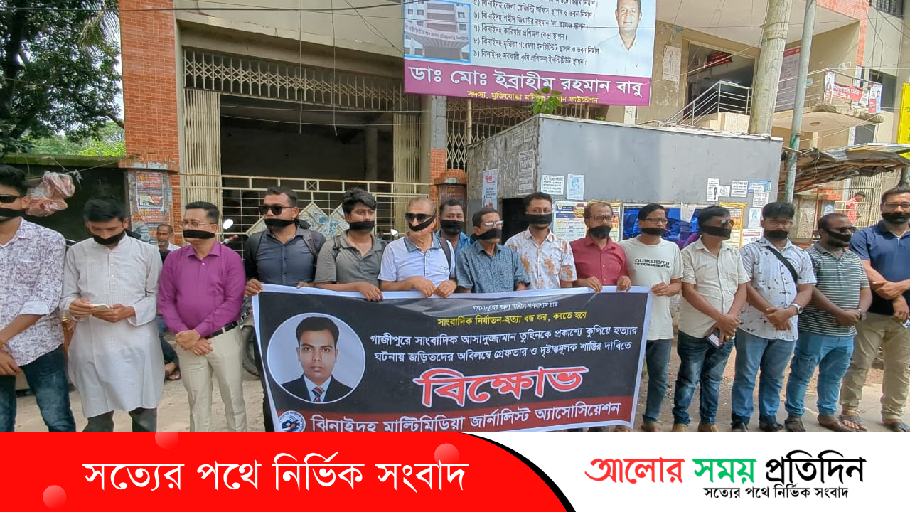 বিক্ষোভ কর্মসূচি শেষে গণমাধ্যমে কর্মীদের নেতৃবৃন্দ জানান, গাজীপুরে স্থানীয় সাংবাদিক মো. আসাদুজ্জামান তুহিনকে নৃশংসভাবে কুপিয়ে হত্যা করা হয়েছে। এই হত্যাকাণ্ডে সাংবাদিক সমাজ তীব্র নিন্দা ও গভীর শোক জানিয়েছে। এ ঘটনা শুধু একজন সাংবাদিককে হত্যা নয়, এটি মুক্ত সাংবাদিকতা ও মতপ্রকাশের স্বাধীনতার ওপর নগ্ন আঘাত। সাম্প্রতিক সময়ে সাংবাদিকদের ওপর হামলা, মিথ্যা মামলা, নির্যাতন ও হত্যার ঘটনা উদ্বেগজনকভাবে বেড়েছে। বিচারহীনতা ও নিরাপত্তাহীনতা এই সহিংসতার বড় কারণ। অপরাধীরা শাস্তি না পাওয়ায় এবং সাংবাদিকদের পর্যাপ্ত সুরক্ষা না থাকায় হামলার ঘটনা বারবার ঘটছে। এতে সংবাদমাধ্যমের স্বাধীনতা মারাত্মকভাবে হুমকির মুখে পড়েছে। পাশাপাশি গণতন্ত্র ও মানবাধিকারও সংকটের দিকে ধাবিত হচ্ছে। সাংবাদিক নেতৃবৃন্দ আরো বলেন, সাংবাদিক তুহিনের হত্যাকারীদের দ্রুত গ্রেপ্তার ও দৃষ্টান্তমূলক শাস্তি নিশ্চিত করা, সাংবাদিকদের নিরাপত্তা নিশ্চিতে আলাদা আইন প্রণয়ন ও তার কার্যকর বাস্তবায়ন। সাংবাদিকদের ওপর সব প্রকার হয়রানি, মিথ্যা মামলা ও নিপীড়ন বন্ধে জরুরি পদক্ষেপ। সাংবাদিক নিগ্রহ ও হত্যার প্রতিটি ঘটনায় নিরপেক্ষ তদন্ত এবং আলাদা টাস্কফোর্স গঠন। সংবাদমাধ্যমের স্বাধীনতা নিশ্চিত করতে রাষ্ট্রীয় পর্যায়ে গঠনমূলক ও টেকসই উদ্যোগ। এসসময় অবস্থান বিক্ষোভে অংশ নেওয়া বিভিন্ন সামাজিক-সাংস্কৃতিক নেতৃবৃন্দ বলেন, দেশের সব গণমাধ্যম, সাংবাদিক সংগঠন ও নাগরিক সমাজকে এই হত্যাকাণ্ডের বিরুদ্ধে ঐক্যবদ্ধ প্রতিরোধ গড়ে তুলতে হবে। ঝিনাইদহ মাল্টিমিডিয়া জার্নালিস্ট অ্যাসোসিয়েশন আয়োজিত মুখে কালো কাপড় বেঁধে অনুষ্ঠিত মৌন মিছিল ও অবস্থান বিক্ষোভ থেকে গাজীপুরে সাংবাদিক আসাদুজ্জামান তুহিন হত্যায় তীব্র নিন্দা ও প্রতিবাদ জানান বিভিন্ন শ্রেণি-পেশার মানুষ।