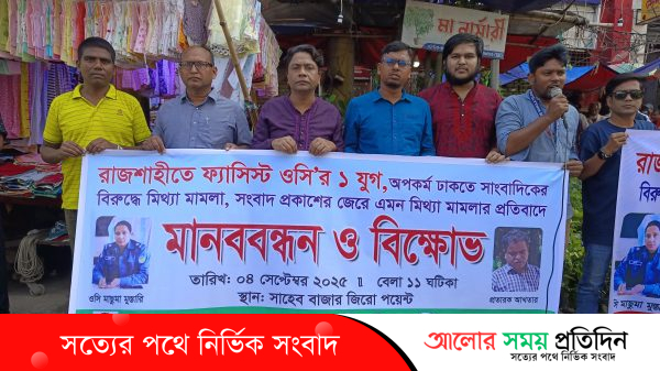 সাংবাদিকদের বিরুদ্ধে মামলা প্রত্যাহার ও বিতর্কিত ওসিকে প্রত্যারের দাবিতে সাংবাদিকদের মানববন্ধন