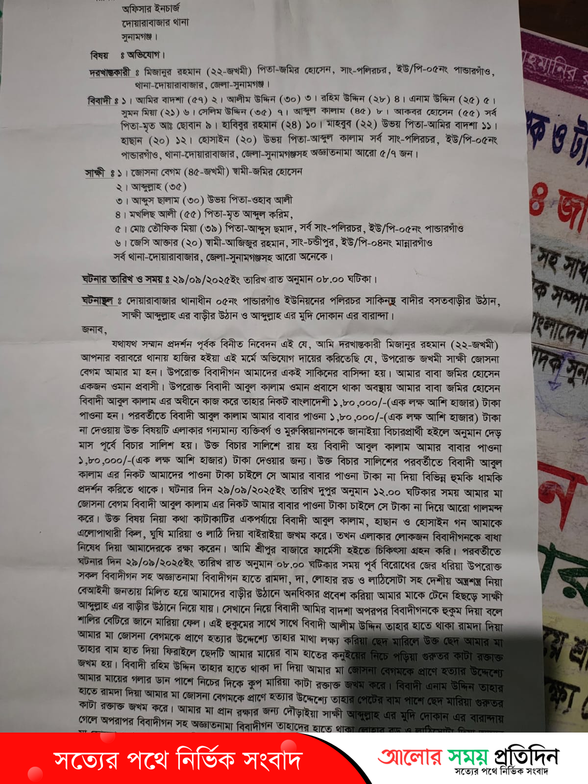 এ ঘটনায় ভুক্তভোগীর ছেলে মিজানুর রহমান দোয়ারাবাজার থানায় লিখিত অভিযোগ দায়ের করেছেন।