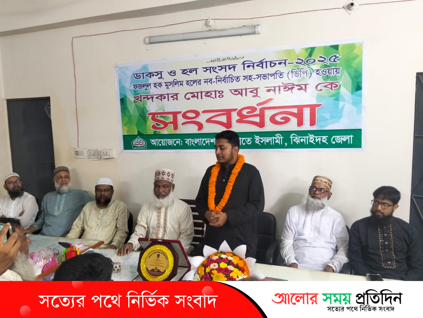 ঢাকা বিশ্ববিদ্যালয় কেন্দ্রীয় ছাত্র সংসদ (ডাকসু) নির্বাচনে ফজলুল হক মুসলিম হলের নবনির্বাচিত সহ-সভাপতি (ভিপি) খন্দকার মো. আবু নাঈমকে সংবর্ধনা দেওয়া হয়েছে। বৃহস্পতিবার সকালে ঝিনাইদহ শহরের হামদহ এলাকায় জেলা জামায়াতে ইসলামীর কার্যালয়ে এই সংবর্ধনা অনুষ্ঠিত হয়।