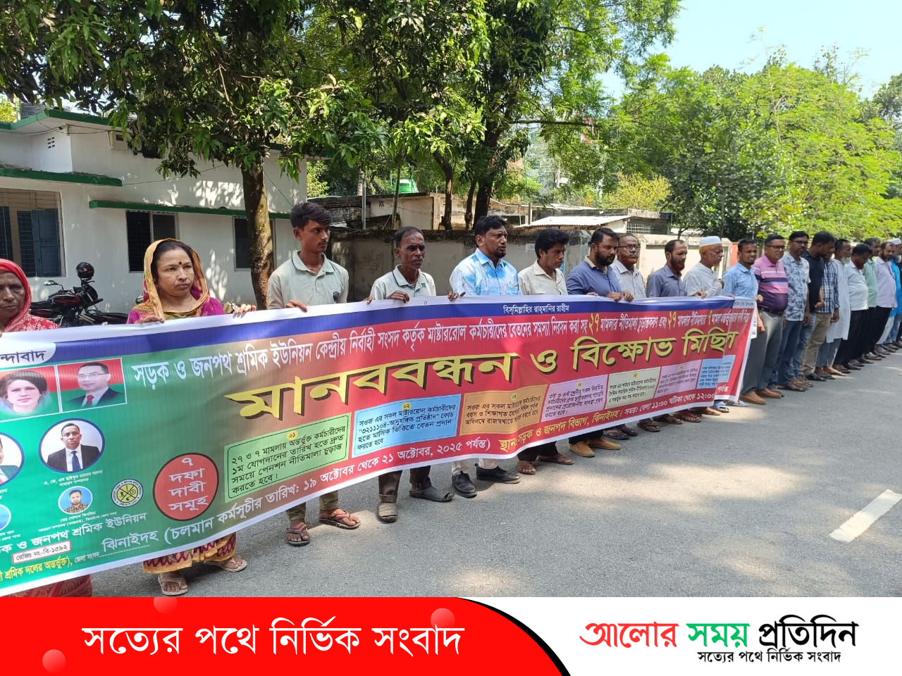 ঝিনাইদহে ৭ দফা দাবী বাস্তবায়নে মানববন্ধন ও বিক্ষোভ মিছিল করেছে সড়ক ও জনপথ বিভাগের কর্মচারীরা। সোমবার সকালে সড়ক বিভাগের সামনে শ্রমিক ইউনিয়নের কেন্দ্রীয় কর্মসূচীর অংশ হিসেবে মানববন্ধন ও বিক্ষোভ সমাবেশ অনুষ্ঠিত হয়।