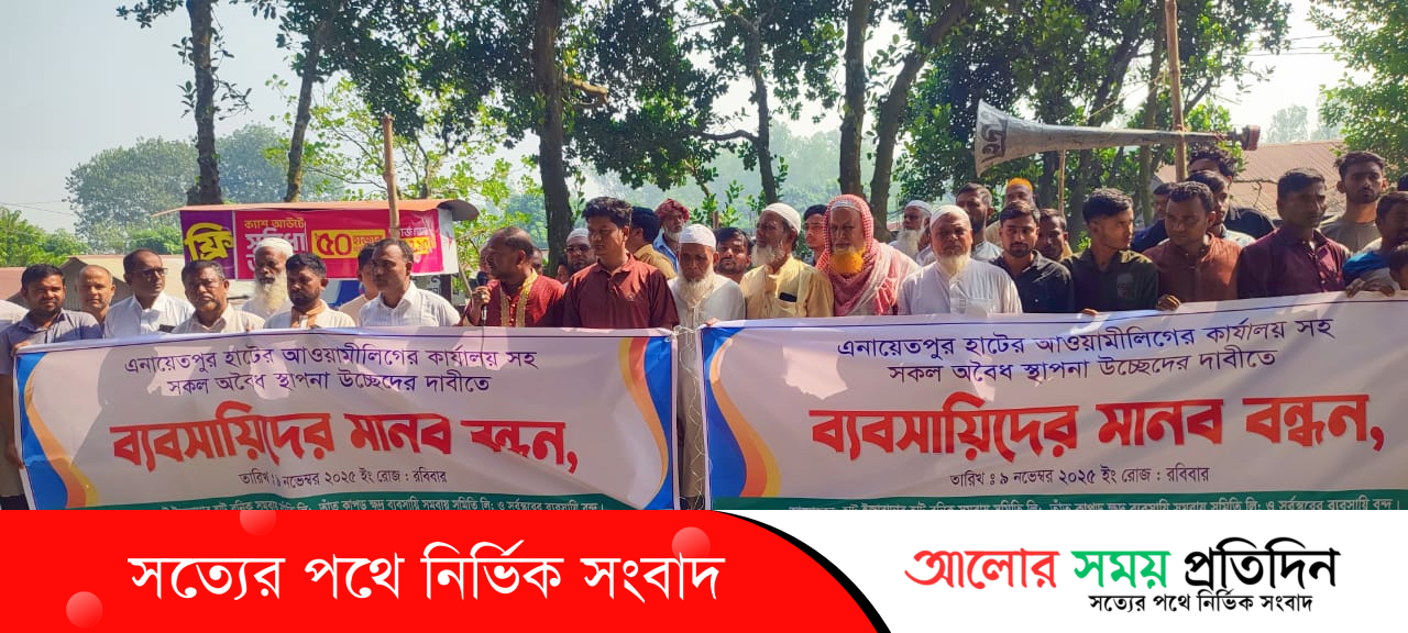 এডময় এনায়েতপুর হাট ইজারাদার, হাট বণিক সমবায় সমিতি লিমিটেড এবং তাঁত কাপড় ক্ষুদ্র ব্যবসায়ী সমবায় সমিতি লিমিটেডের যৌথ উদ্যোগে আয়োজিত এ মানববন্ধনে শতাধিক ব্যবসায়ী অংশ নেন।