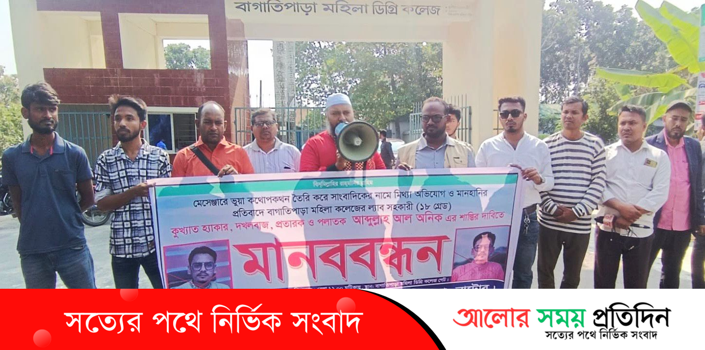 বৃহস্পতিবার (১৩ নভেম্বর) বেলা ১২টার দিকে বাগাতিপাড়া মহিলা ডিগ্রি কলেজের সামনে এ মানববন্ধনের আয়োজন করে স্থানীয় সাংবাদিক সমাজ ও সাধারণ মানুষ।