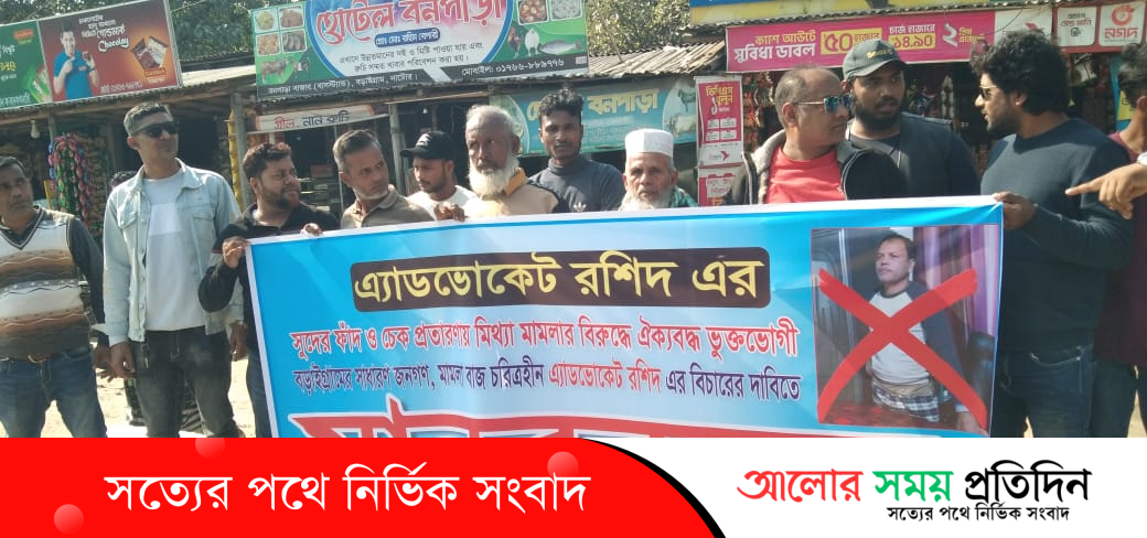 নাটোরের বড়াইগ্রাম উপজেলার বনপাড়া পৌরসভার সামনে সুদের ফাঁদ ও চেক প্রতারণার মাধ্যমে সহজ-সরল মানুষকে ফাঁসিয়ে মিথ্যা ও হয়রানিমূলক মামলা দেওয়ার অভিযোগে এক আইনজীবীর বিরুদ্ধে মানববন্ধন কর্মসূচি পালন করেছে ভুক্তভোগী এলাকাবাসী।