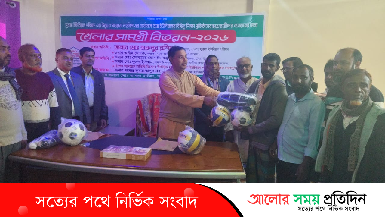 বুধবার ৭ জানুয়ারি বিকেলে আনন্দমুখর পরিবেশে উপজেলার সুরমা ইউনিয়ন পরিষদের আয়োজনে ইউনিয়ন পরিষদের প্রশাসনিক কর্মকর্তা গুণেন্দ্র কুমার তালুকদারের সভাপতিত্বে ৭ নং ওয়ার্ডের ইউপি সদস্য আব্দুল হামিদের সঞ্চালনায় প্রধান অতিথি হিসেবে উপস্থিত ছিলেন সুরমা ইউনিয়ন পরিষদের চেয়ারম্যান মোঃ হারুনুর রশিদ,এসময় প্রধান অতিথির বক্তব্যে তিনি বলেন, সুরমা ইউনিয়ন পরিষদের পক্ষ থেকে বিভিন্ন শিক্ষা প্রতিষ্ঠানের শিক্ষার্থীদের জন্য কেরামবোর্ড,ফুটবল,বলিবল,দাবাবোর্ড, বিতরণ করেছেন। এসময় তিনি সকলের নিকট দোয়া ও সহযোগিতা কামনা করেছেন।